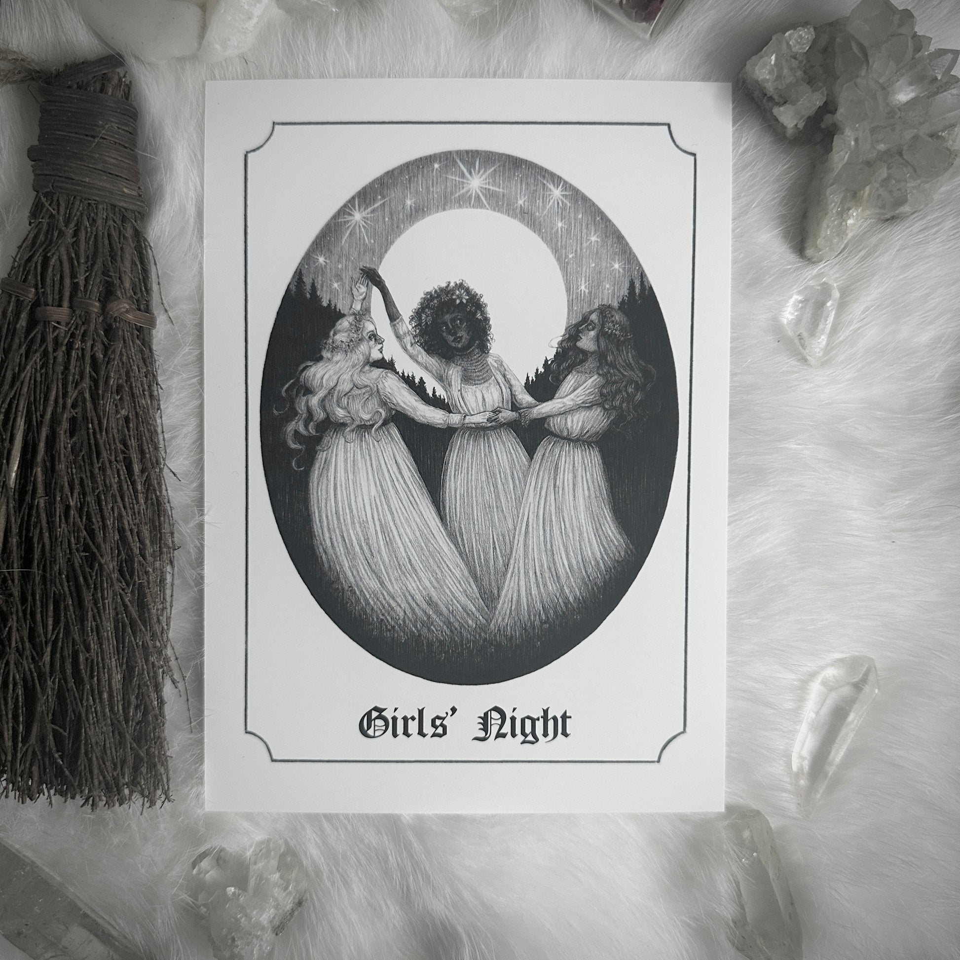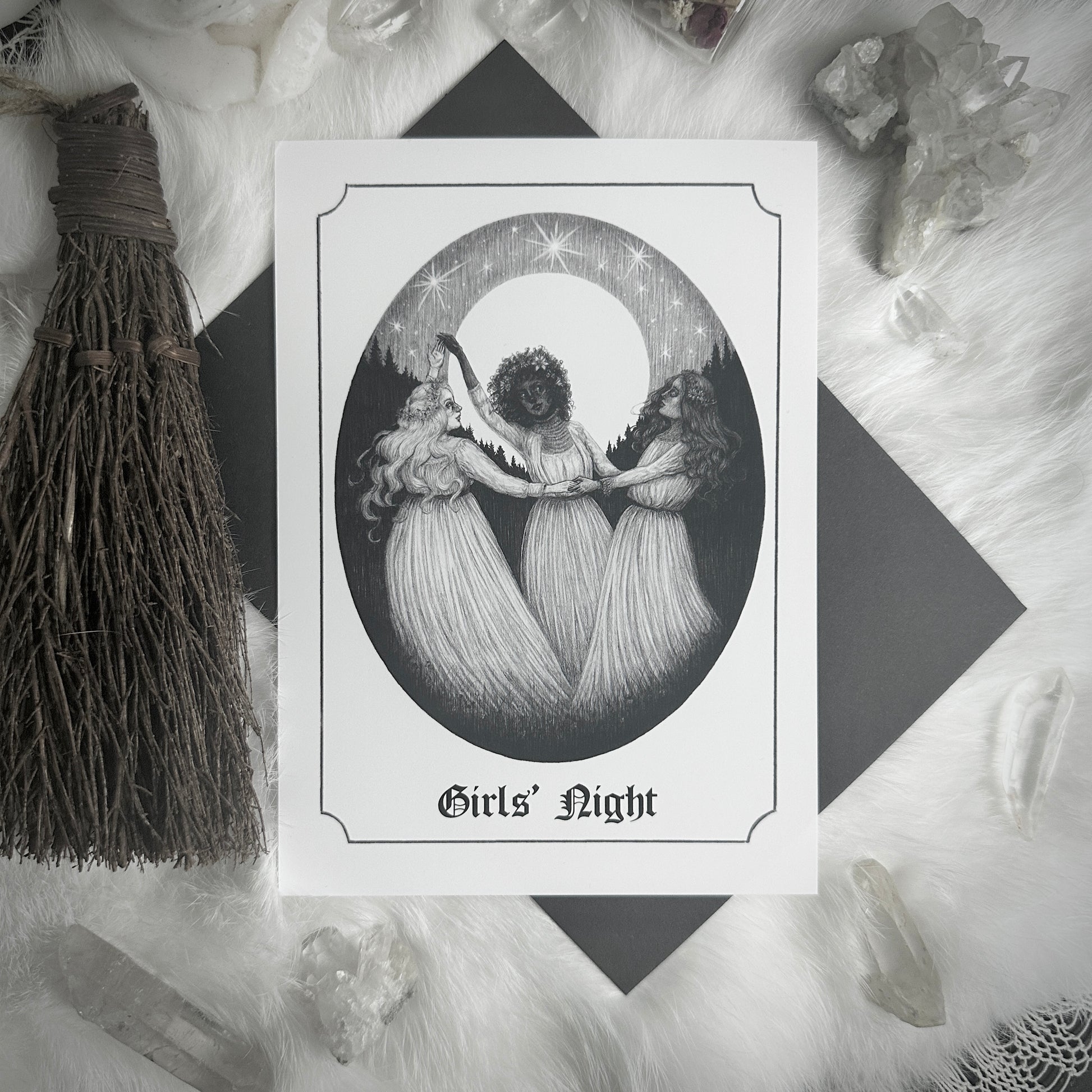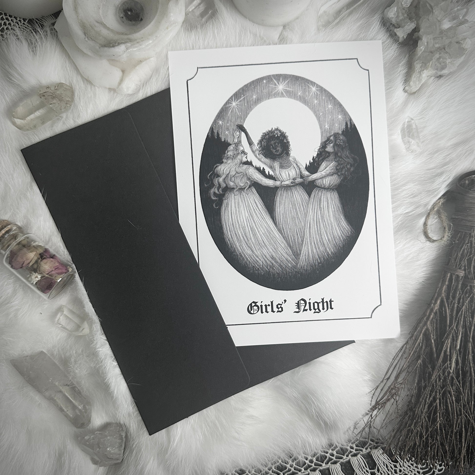 Front of card features an original illustration of coven of 3 witches dancing under a full moon by Caitlin McCarthy. Text reads" Girls’ Night" in a gothic font.