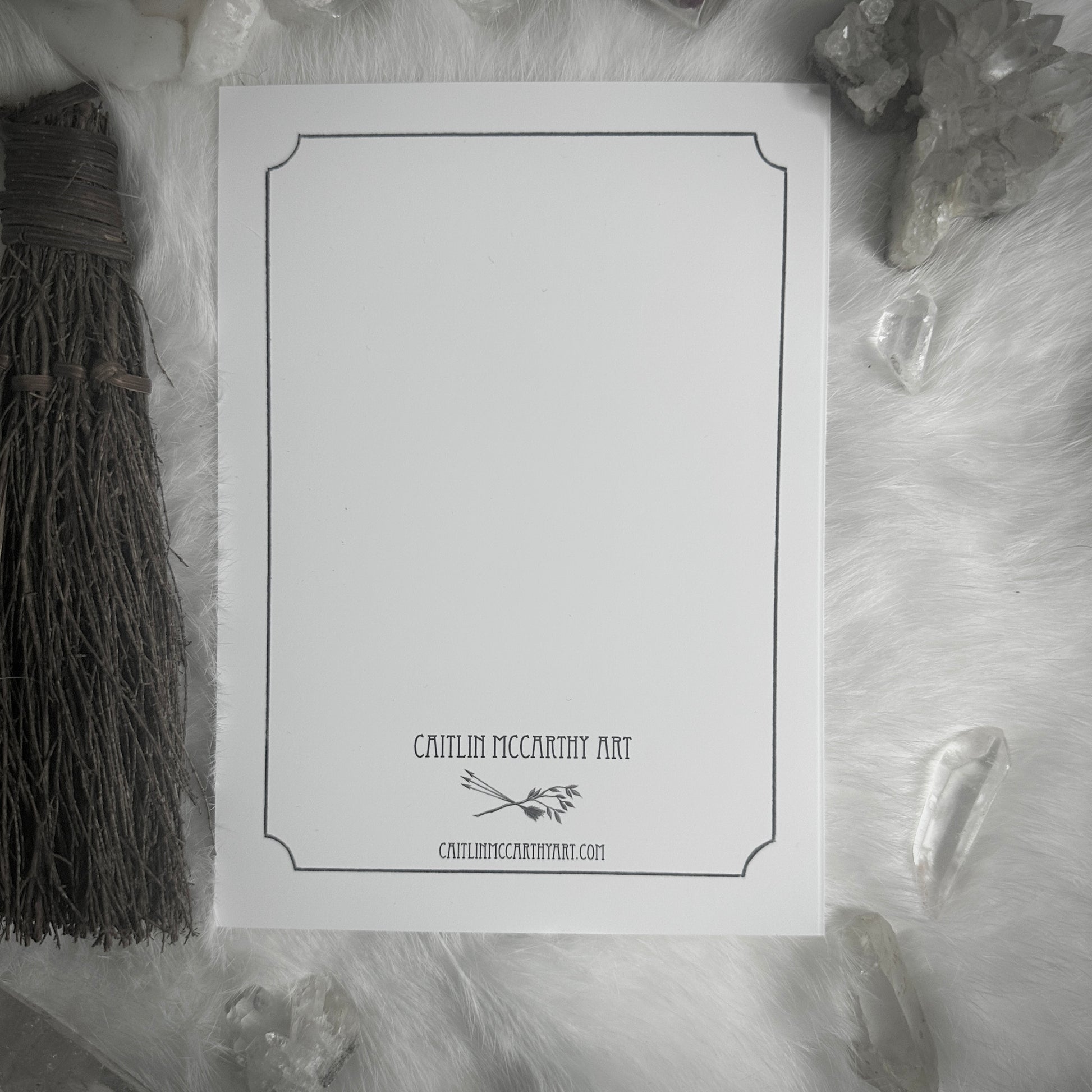 4.5x6.25” folded greeting card. The card is packed in a protective cellophane sleeve and includes a black envelope. Printed in house on high quality matte cardstock.