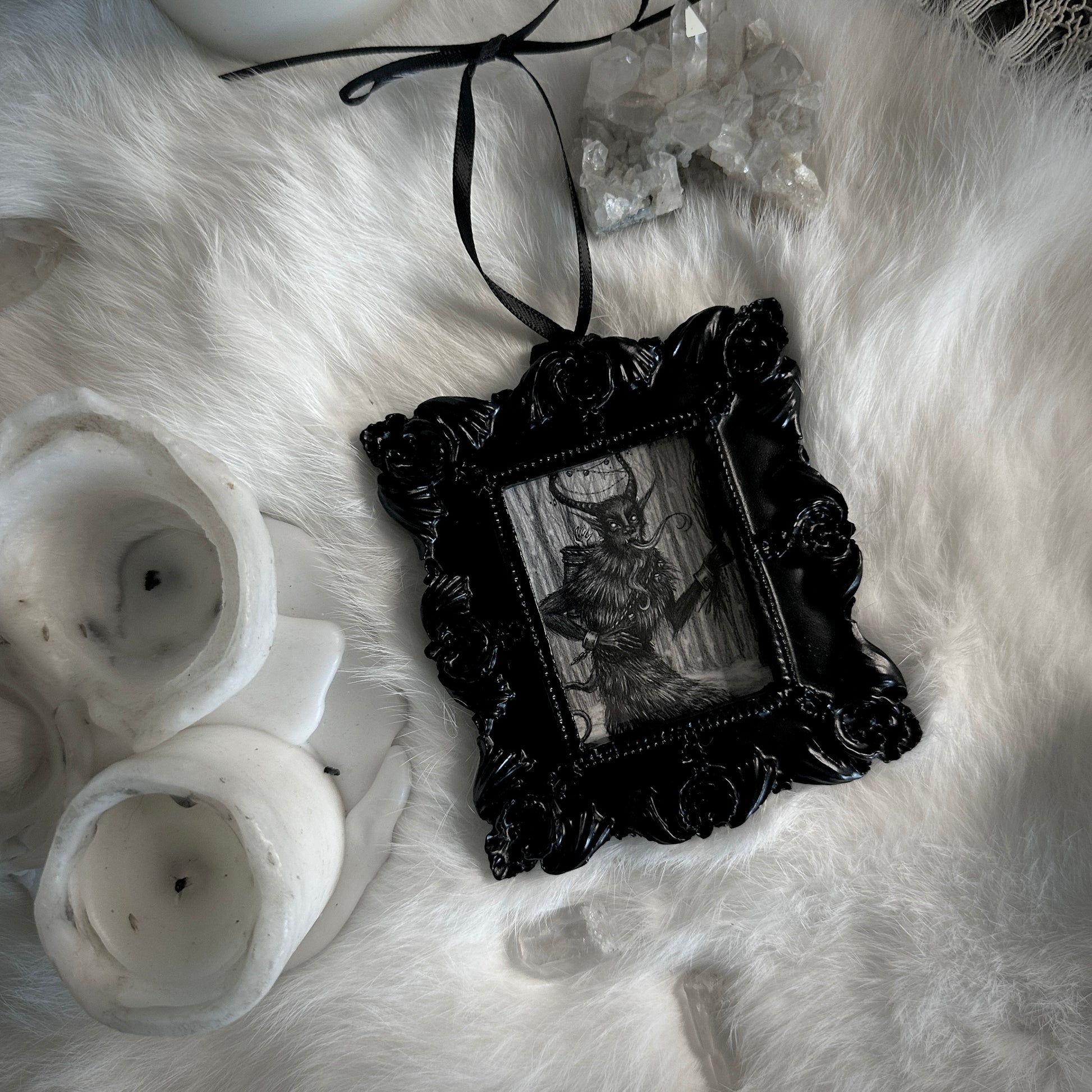 This ornament features a custom signed print by Caitlin McCarthy inside an ornate matte black frame. Has a ring and black ribbon for hanging. Also features an easel stand for tabletop of shelf placement.
