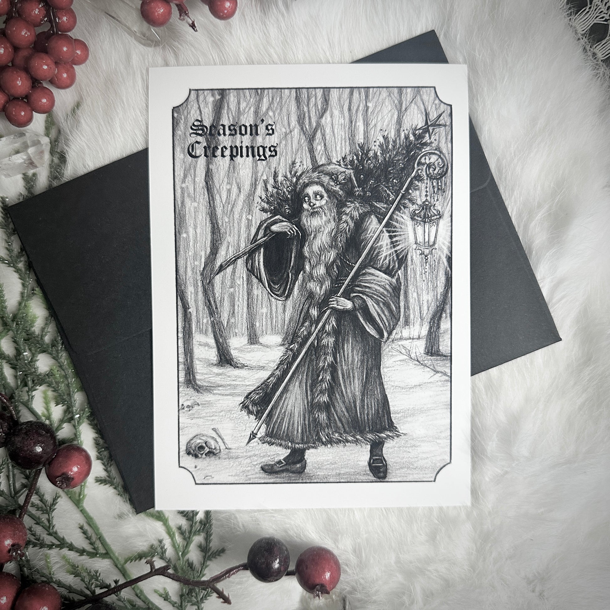 4.5x6.25” folded greeting card. The card is packed in a protective cellophane sleeve and includes a black envelope. Printed in house on high quality matte cardstock.