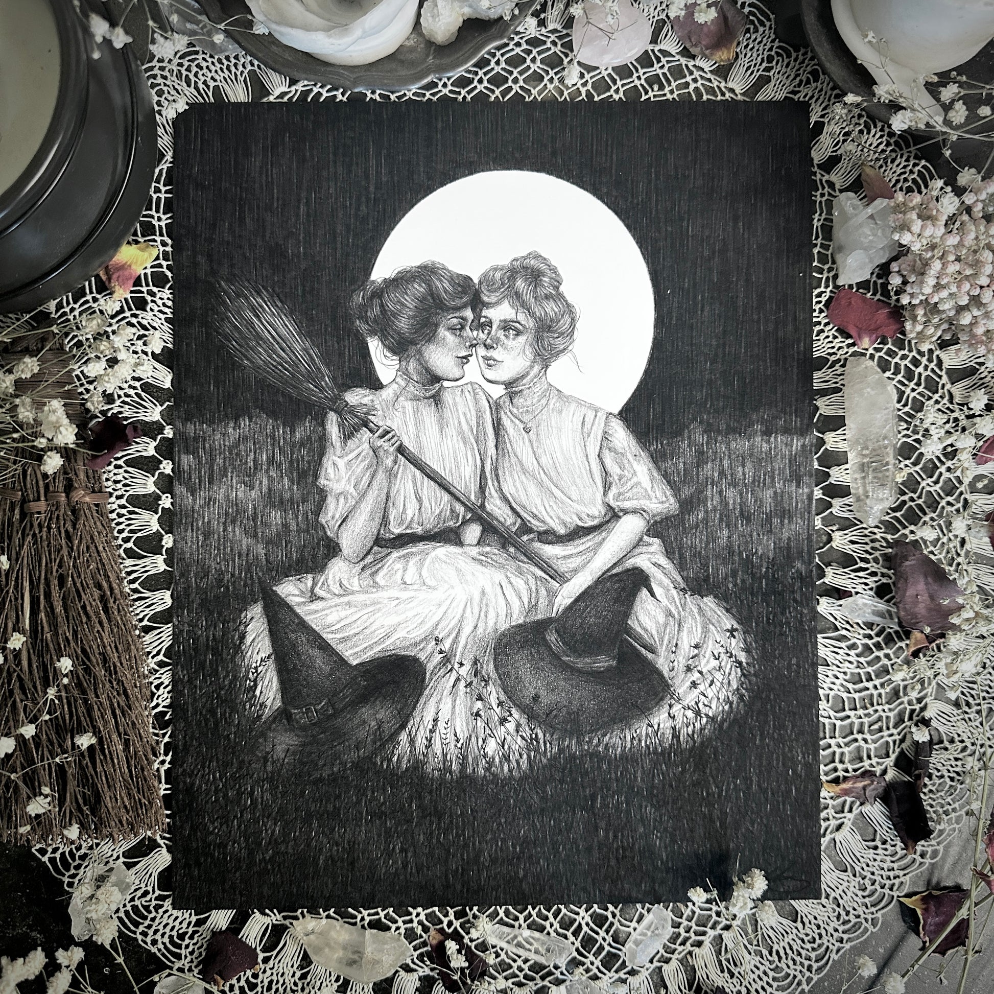 These sweet witches are sharing a tender moment during their moonlit picnic.
